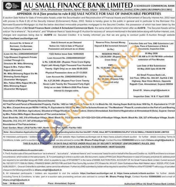 Description of Mortgage Property (Secured Assets) : All That Part and Parcel of Residential Property, Flat No. 1402 on 14th Floor, in Tower G, H, I in Block No. G2, Having Super Built Up Area 1850 Sq. Ft. Equivalent to 171.87 Sq. Mirs. (Carpet Area as per RERA 1140 Sq. Ft. Equivalent to 105.91 Sq. Mtrs.) in the Scheme Known as "The Meadows" Phase III, constructed on the Part of Land Bearing Block No. 319, 320 (Non-Agriculture), Situated at Village Khodiyar, Taluka Daskroi, District Ahmedabad, Sub District Registration at Ahmedabad-8 (Sola), Gujarat. Owned by Mrs. Pallavi Mittu Rajput, Boundaries of The Land as below: