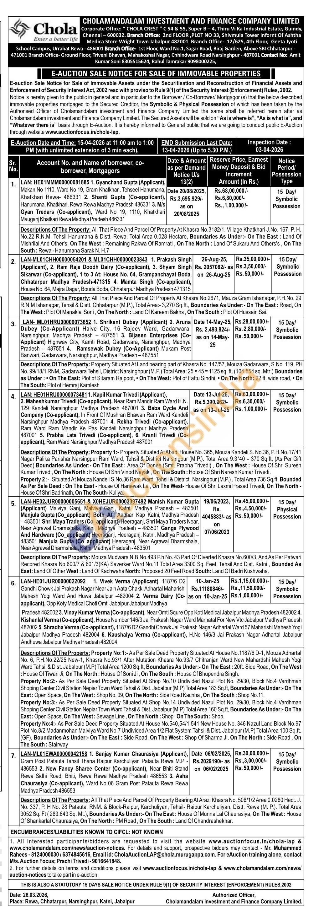 Descriptions Of The Property: Property Situated At Land bearing part of Khasra No. 147/57, Mouza Gadarwara, S.No. 119, PH No. 99/18/1 RNM, Gadarwara Tehsil, District Narsinghpur (M.P.) Total Area: 25 x 45=1125 sq. ft. (104.554 sq. Mtr.) Boundaries as Under: On The East: Plot of Sitaram Rajpoot, On The West: Plot of Fattu Sindhi, On The North: 22 ft. wide road, On The South: Plot of Hemraj Kamlesh