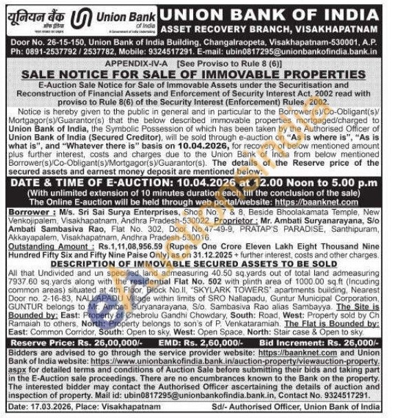 All that Guntur Undivided and un specified land admeasuring 40.50 sq.yards out of total land admeasuring 7937.60 sq yards along with the residential Flat No. 502 with plinth area of 1000.00 sq.ft (Incuding common areas) situated at 4th Floor, Block No.II, "SKYLARK TOWERS apartments building, Nearest Door no. 2-16-83, NALLAPADU Village within limits of SRO Nallapadu, Guntur Municipal Corporation, GUNTUR belongs to Mr. Ambati Suryanarayana, Sio. Sambasiva Rao alias Sambayya. The Site is Bounded by: East: Property of Chebrolu Gandhi Chowdary, South: Road, West: Property sold by Ch Ramaiah to others, North: Property belongs to son's of P. Venkataramiah. The Flat is Bounded by: East: Common Corridor, South: Open to sky, West: Open Space, North: Stair case & Open to sky