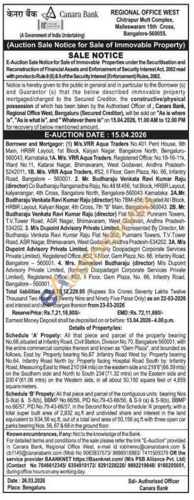 Schedule 'A' Propety: All that piece and parcel of the property bearing No.66, situated at Infantry Road, Civil Station, Division No.70, Bangalore 560001, with the entire commercial complex thereon and known as "Gem Plaza", and bounded as follows, East by: Property bearing No.67 Infantry Road West by: Property bearing No.64, Infantry Road North by: Property facing Hospital Road South by: Infantry Road, Measuring East to West 210 (64 mts) on the eastern side and 218'6'(66.59 mts) on the Southern side and North to South 234 (71.32 mtrs) on the Eastern side and 2004"(61.06 mtrs) on the Westem side, in all about 50,150 square feet or 4,659 square meters. Schedule 'B' Propety: All that piece and parcel of the contiguous units bearing Nos S-8(a) & S-8(b), BBMP No.66/56, PID No.79-43-66/56, & S-9 (a) & S-9(b), BBMP no 66/57, PID No.79-43-66/57, in the Second floor of the Schedule 'A' property, with a total super built area of 2,832 sq.ft and undivided share and interest in the land equivalent to 934.56 sq.ft, out of a total land area of 50,156 sq.ft with three open car parks bearing Nos. 56, 67 & 68 in the ground floor.