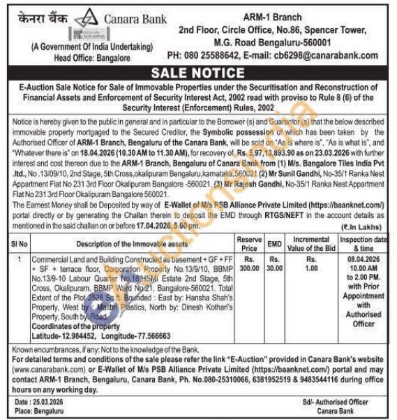Commercial Land and Building Constructed as basement+GF+FF SF terrace floor, Corporation Property No. 13/9/10, BBMP No.13/9-10 Labour Quarter No.18,HSMI Estate 2nd Stage, 5th Cross, Okalipuram, BBMP Ward No.21, Bangalore-560021. Total Extent of the Plot 2528 Sq.ft. Bounded: East by: Hansha Shah's Property, West by: Maithri Plastics, North by: Dinesh Kothari's Property, South by: Road.