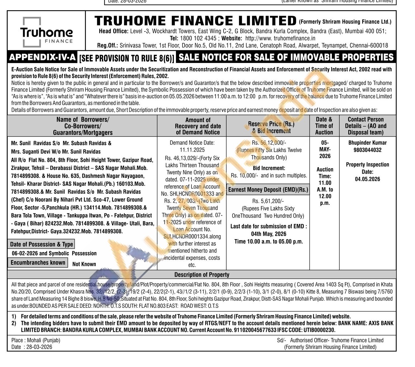 All that piece and parcel of one residential house/property/land/Plot/ Property/ commercial/ Flat No. 804, 8th Floor, Sohi Heights measuring (Covered Area 1403 Sq Ft), Comprised in Khata No.20/20, Comprised Under Khasra Nos. 32//12/2, (2-3), 19/2 (2-4), 22/2(2-1), 43//1/2 (3-11), 2/2/1 (0-9), 2/2/3 (1-10), 3/1 (2-0), 8/1 (0-10) Kitte 8, Measuring 7 Biswasi being 7/5760 share of Land Measuring 14 Bighe 8 biswe, H.B No-50, Situated at Flat No. 804, 8th Floor, Sohi heights Gazipur Road, Zirakpur, Distt-SAS Nagar Mohali Punjab. Which is measuring and bounded as under. BOUNDED AS PER SALE DEED: NORTH: 0.T.S SOUTH: FLAT NO.803 EAST: ROAD WEST: O.T.S
