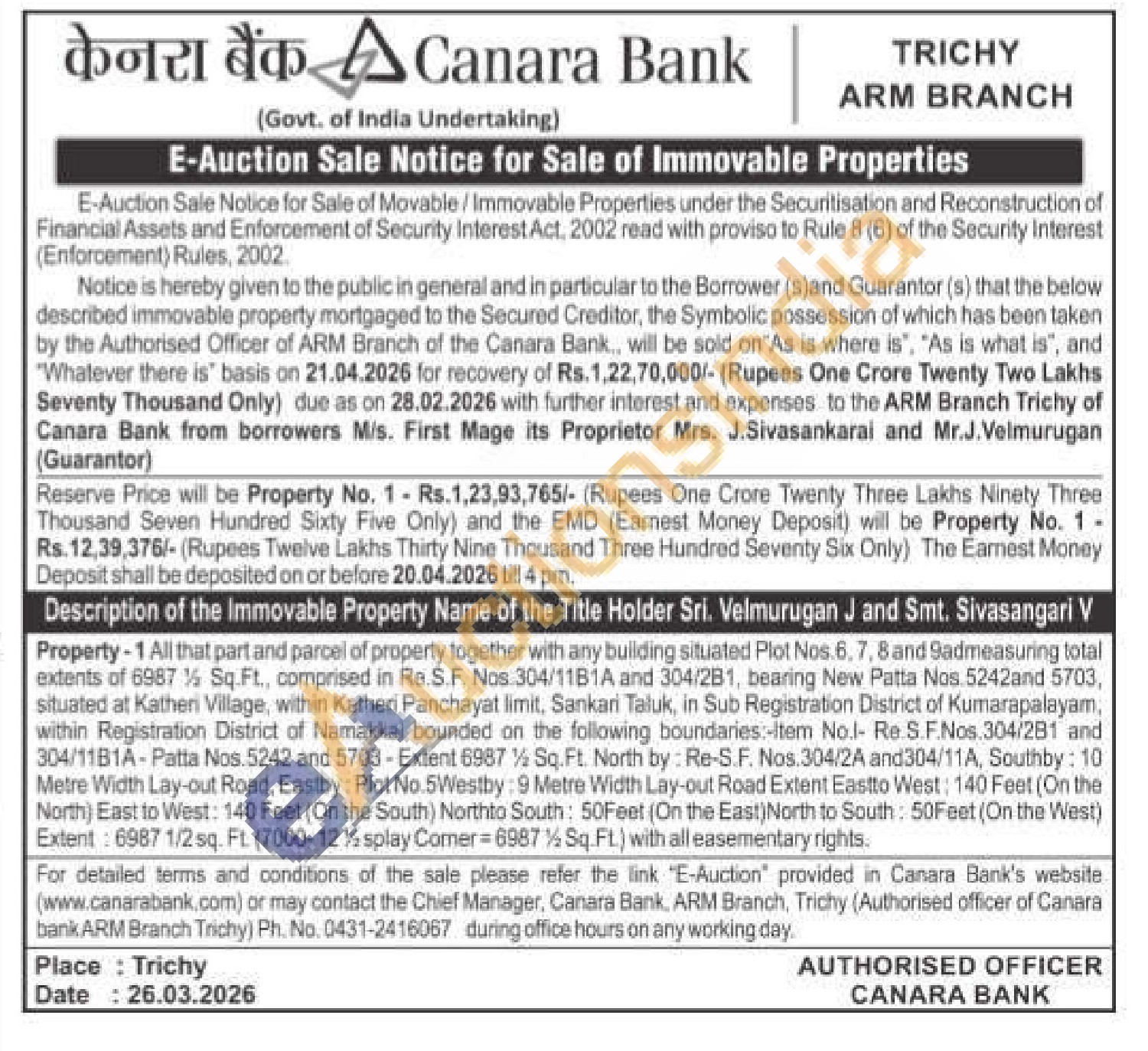 Property-1 All that part and parcel of property together with any building situated Plot Nos.6, 7, 8 and 9admeasuring total extents of 6987 % Sq.Ft., comprised in Re.S.F. Nos 304/11B1A and 304/2B1, bearing New Patta Nos. 5242and 5703, situated at Katheri Village, within Katheri Panchayat limit, Sankari Taluk, in Sub Registration District of Kumarapalayam, within Registration District of Namakkal bounded on the following boundaries:-Item No.I- Re.S.F.Nos.304/281 and 304/11B1A-Patta Nos. 5242 and 5703-Extent 6987½ Sq. Ft. North by: Re-S.F. Nos.304/2A and304/11A, Southby: 10 Metre Width Lay-out Road, Eastby: Plot No.5Westby: 9 Metre Width Lay-out Road Extent Eastto West: 140 Feet (On the North) East to West: 140 Feet (On the South) Northto South: 50Feet (On the East) North to South: 50Feet (On the West) Extent: 6987 1/2 sq. Ft. (7000-12%splay Comer 6987½ Sq.FL) with all easementary rights.