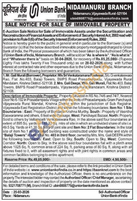 Property Situated in RS No. 74/6 and 74/7, Nearest Door No 6-192 in Prasadampadu Village within the limits of Prasadampadu Gram Panchayat. Vijayawada Rural Mandal, Krishna District within the jurisdiction of Sub Registrar, Vijayawada East Registration District and within the following boundaries: Item No: 1 Site Boundaries: East: Property of Bondada Krishna Murthy, South: Property of Vasntha Easwaramma and others, 6 feet wide Passage, West: Panchayat Bazaar, North: Property Sold to others by Vellampalli Venkateswara Rao, In the above said four boundaries an extent of 895 Sq., yards or 748.33 Sq. mirs of site in which an undivided share of site i.e. 49.5 Sq. Yards or 41.38 Sq. Mtrs of joint site and Item No: 2 Flat Boundaries: In the total site of item No.1 multi storied building was constructed under the name and style of "Balaji Towers" in which flat No. 403 in third floor, owned by Mrs. Mrs. Gali DEEPA within the following boundaries: East: Open to Sky, South: Open to Sky, West: Common Corridor, North: Open to Sky, In the above said four boundaries flat with a plinth area above 1025 Sq. ft, common area of 224 Sq. ft, parking area of 80 Sq. ft, along with all fixtures fixed to it, with all easement rights and with joint rights in common areas and common facilities belonging to entire apartment
