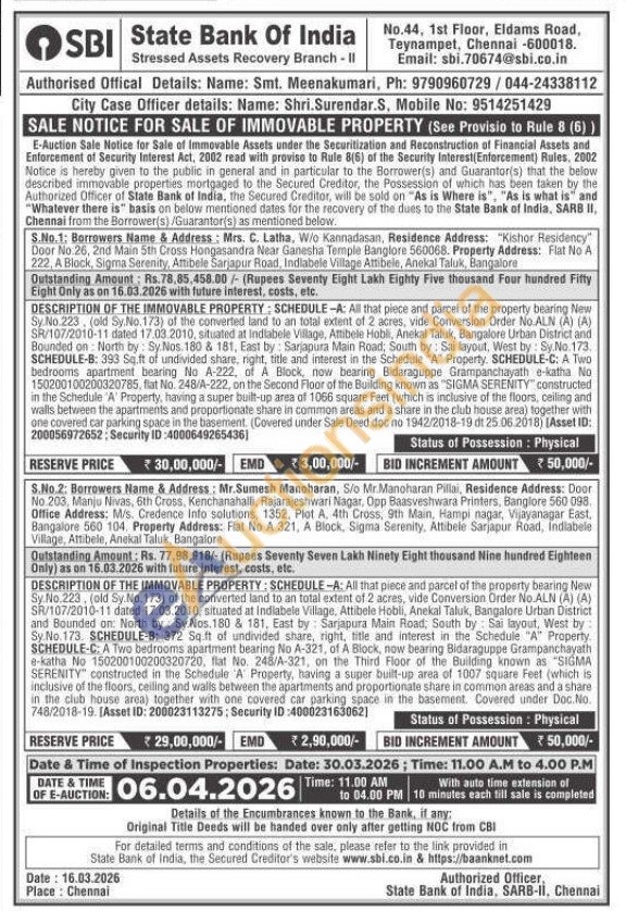 All that piece and parcel of the property bearing New Sy.No.223, (old Sy.No.173j of the converted land to an total extent of 2 acres, vide Conversion Order No.ALN (A) (A) SR/107/2010-11 dated 17.03.2010, situated at Indiabele Village, Attibele Hobli, Anekal Taluk, Bangalore Urban District and Bounded on: North by Sy Nos. 180 & 181, East by Sarjapura Main Road, South by Sai layout, West by: Sy No. 173. SCHEDULE-B: 372 Sq.ft of undivided share, right, title and interest in the Schedule "A" Property. SCHEDULE-C: A Two bedrooms apartment bearing No A-321, of A Block, now bearing Bidaraguppe Grampanchayath e-katha No 150200100200320720, flat No. 248/A-321, on the Third Floor of the Building known as "SIGMA SERENITY" constructed in the Schedule A Property, having a super built-up area of 1007 square Feet (which is inclusive of the floors, ceiling and walls between the apartments and proportionate share in common areas and a share in the club house area) together with one covered car parking space in the basement. Covered under Doc.No. 748/2018-19. [Asset ID: 200023113275: Security ID:400023163062)