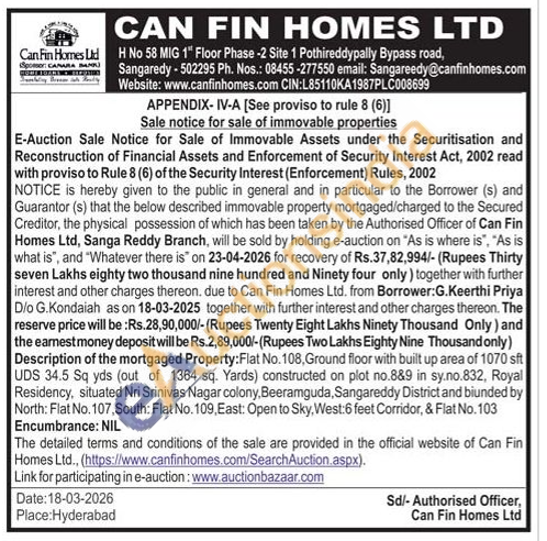 Flat No. 108, Ground floor with built up area of 1070 sft UDS 34.5 Sq yds (out of 1364 sq. Yards) constructed on plot no.889 in sy.no.832, Royal Residency, situated Nri Srinivas Nagar colony, Beeramguda, Sangareddy District and biunded by North: Flat No. 107, South: Flat No. 109, East: Open to Sky, West:6 feet Corridor, & Flat No. 103