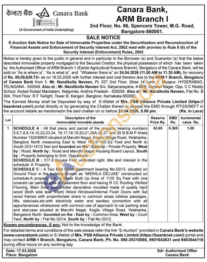 SCHEDULE A: All that piece and parcel of the property bearing numbers 5,6,7,8,9,14,15,22,23,24, 16,17,18,19,20,21,25A,26,27 and 28 B.B.M.P khata Number 1324/866/5 situated at Maruthi Nagar, Kogilu Village Road, Yelahanka, Banglore North measuring East to West 183.5+165.3/2 Feet and North to South 223+147/2 feet and bounded on the East by: Private Property, West by: Road, North by: Road and Maruthi Nagar Housing Board Layout, South by: Property belonging to Smt. Vijayamma. SCHEDULE B: 317.9 Square Feet undivided right, title and interest in the schedule 'A' Property. SCHEDULE C: A Two Bed Room Apartment bearing No.G013, situated on Ground Floor in the building Known as "MIDHILA DELUXE" constructed on schedule-A property with a Super Built Up Area of 1135 Sq Feet with one covered car parking area in Basement floor and having R CC Roofing Vitrified Flooring, Main Door and shutter decorative moulded made of quality hard wood (Both side teak finish) Wood Windows/Internal Flush Doors with Sal wood frames with proportionate share in common areas lobbies passages, lifts, staircase, etc, with electricity water and sanitary connection with all appurtenances whatsoever with common use of approach to car parking area and staircase situated at Maruthi Nagar, Kogilu Village Road, Yelahanka, Bangalore North. bounded on the East by: Common Area, West by: Court Yard, North by: Flat No G014, South by: Flat No G012.