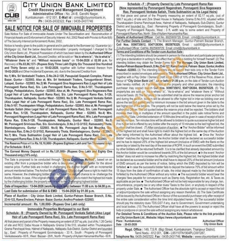 All that piece and parcel of the Property measuring an extent of 207 sq.yds. (out of Ac. 1.26 Cents) of site and RCC Daba House in Nallapadu Grama D.No.510, situated within Thurakapalem Grama Panchayat Area. Haimet of Nallapadu, Nallapadu Sub-District, Guntur District and bounded by East Property of Ponnaganti Govindarajulu-33 ft, South Property of Ponnagant Venkateswarla-60 ft., West: Bazaar-29 ft, North Property of Ayilam Hanumantha Rao-60