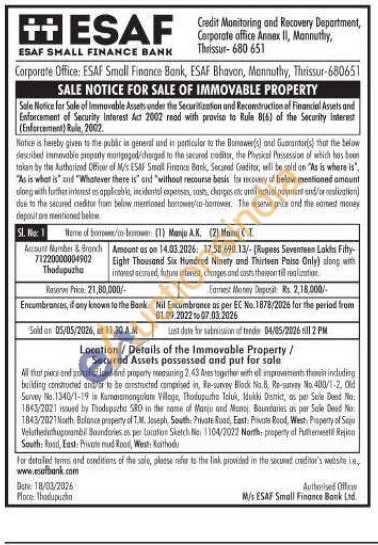 All the pics and parcel of land and property measuring 2.43 Anes together with all improvements themelt induding building comaruded antilor to be constructed comprised in, Re-suney Block No. Resume No.400/1-2.0 Soney No. 1340/1-19 in Kumamongolare Vilage, Thodupuhe Teluk, iukki Disnict, as per Serie Dand Ne 1843/2021 ed by Thodapache 580 in the name of Marju and Many Boundaries as por Sale Deed No 1043/2021 North Bolance property of T.M. Joseph, South Private Road, East: Private Bood, West Property of Saju Veluhethuparambil Boundaries as per location Sketch No: 1304/2022 North: property of Pulteneet Rajico South: Rool, East: Privat mud Roon, West: Koi