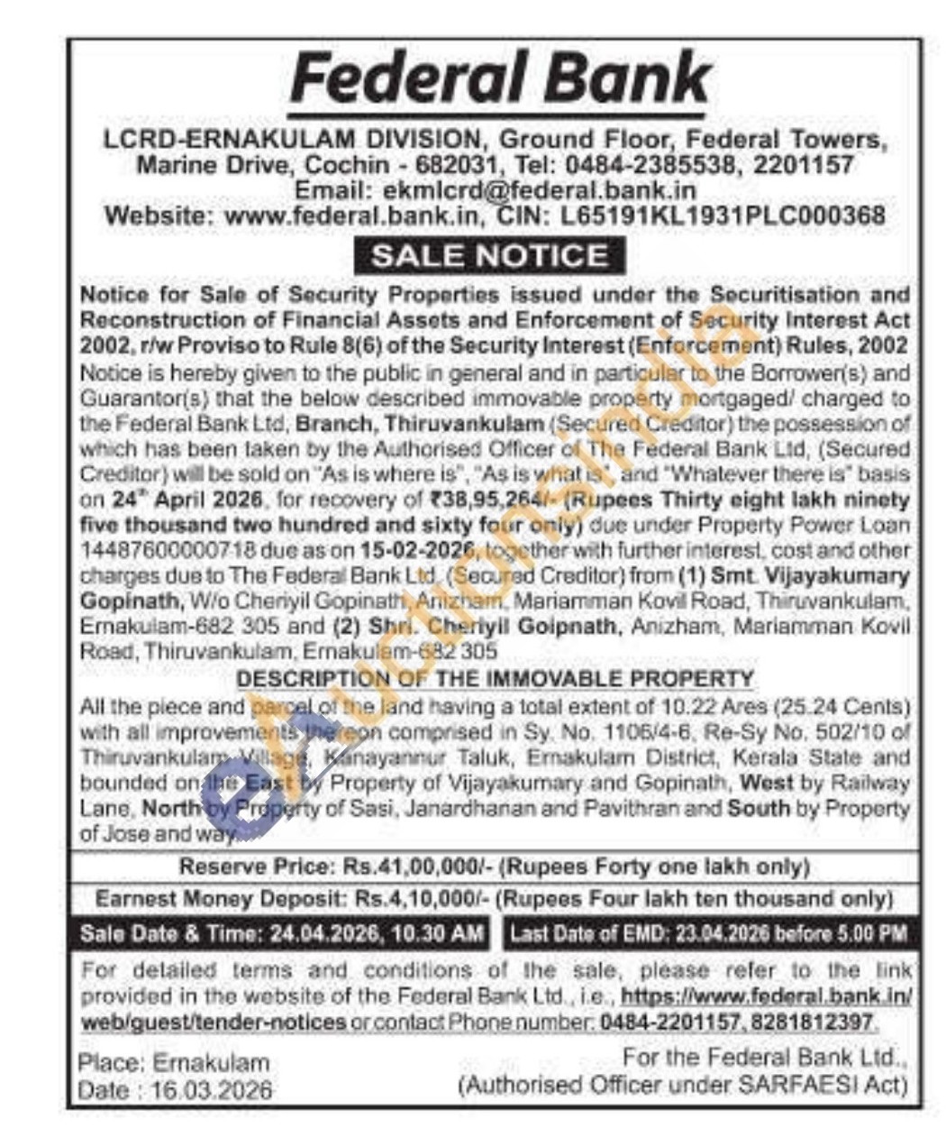 All the piece and parcel of the land having a total extent of 10.22 Ares (25.24 Cents) with all improvements thereon comprised in Sy. No. 1106/4-6, Re-Sy No. 502/10 of Thiruvankulam Village, Kanayannur Taluk, Ernakulam District, Kerala State and bounded on the East by Property of Vijayakumary and Gopinath, West by Railway Lane, North by Property of Sasi, Janardhanan and Pavithran and South by Property of Jose and way.