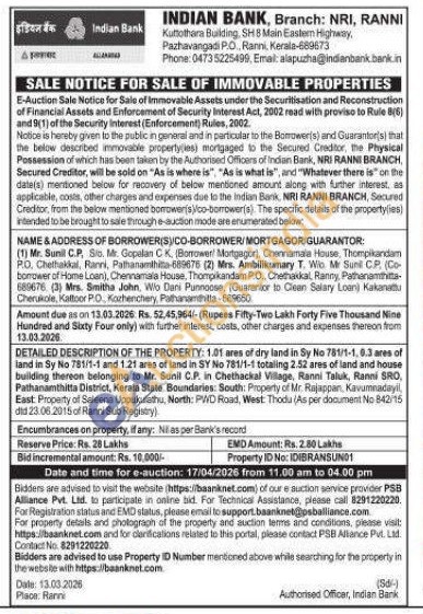1.01 ares of dry land in Sy No 781/1-1.0.3 ares of land in Sy No 781/1-1 and 1.21 ares of land in SY No 781/1-1 totaling 2.52 ares of land and house building thereon belonging to Mr. Sunil C.P. in Chethackal Village, Ranni Taluk, Ranni SRO, Pathanamthitta District, Kerala State. Boundaries: South: Property of Mr. Rajappan, Kavumnadayil, East Property of Saleena Uppukulathu, North: PWD Road, West: Thodu (As per document No 842/15 did 23.06.2015 of Ranni Sub Registry)