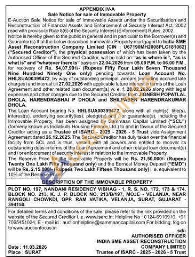 PLOT NO. 197, NANDANI RESIDENCY VIBHAG1, R. S. NO. 172, 173 & 174, BLOCK NO. 213, K. J. P. BLOCK NO. 213/B/197, MOJE VELANJA, NEAR RANGOLI CHOWKDI, OPP. RAM VATIKA, VELANJA, SURAT, GUJARAT 394150.