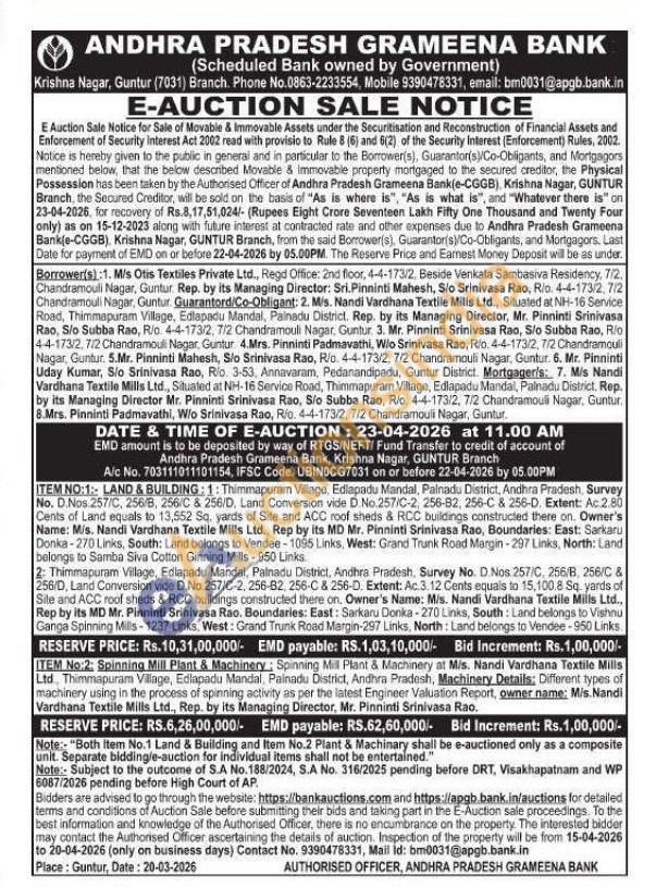 ITEM NO:1:- LAND & BUILDING: 1: Thimmapuram Village, Edlapadu Mandal, Palnadu District, Andhra Pradesh. Survey No. D.Nos 257/C, 256/B, 256/C & 256/D, Land Conversion vide D.No.257/C-2, 256-82, 256-C & 256-D. Extent: Ac.2.80 Cents of Land equals to 13,552 Sq. yards of Site and ACC roof sheds & RCC buildings constructed there on. Owner's Name: M/s. Nandi Vardhana Textile Mills Ltd., Rep by its MD Mr. Pinninti Srinivasa Rao, Boundaries: East: Sarkaru Donka-270 Links, South: Land belongs to Vendee-1095 Links, West: Grand Trunk Road Margin-297 Links, North: Land belongs to Samba Siva Cotton Ginning Mills-950 Links. 2: Thimmapuram Village, Edlapadu Mandal, Palnadu District, Andhra Pradesh, Survey No. D. Nos 257/C, 256/B, 256/C & 256/D, Land Conversion vide D.No 257/C-2, 256-82, 256-C & 256-D. Extent: Ac. 3.12 Cents equals to 15,100.8 Sq. yards of Site and ACC roof sheds & RCC buildings constructed there on. Owner's Name: M/s. Nandi Vardhana Textile Mills Ltd., Rep by its MD Mr. Pinninti Srinivasa Rao. Boundaries: East: Sarkaru Donka-270 Links, South: Land belongs to Vishnu Ganga Spinning Mills-1237 Links, West: Grand Trunk Road Margin-297 Links, North: Land belongs to Vendee-950 Links