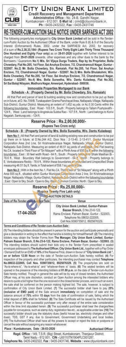 Item No.1: All that Part and parcel of land & building existing now and construction to be put up there on in future, at D. No.244 A/2, Door Nos: 2-13-40, 2-13-41/1, Guntur Muniopal Corporation Area 2nd Line, Sri Krishnadevaraya Nagar, Nallapadu Village, Guntur District, Nallapadu Sub-District. Measuring an extent of 46.51 sq.yards of undivided. One Flal bearing No. C4, located in Third Floor of "Sri Nilayam with a Plinth Area of 935 Sq. ft. within the following boundaries: East: 30 feet width Road-64 ft.. South Property belongs to Shaik Masthan Bi-78.6 ft., West Boundary Wall belongs to Government-64ft, North Property belongs to E. Venkateswara Reddy-78.6 ft. Within these boundaries an undivided and Unspecified Share measuring 46.51 Sq ft. Yards, in Total extent of 558.1 sq yards of Site. Item No.2: With in the item No. 1, Flat No.C4, Third Floor of "Sn Nilayam" along with a Plinth Area 935 sq ft, situated within Guntur Municipal Corporation Area 2 line, Sri Krishnadevaraya Nagar, Nallapadu Village, Guntur District, Nallapadu Sub-District within the following boundaries East: Open to Sky, South: Open to Sky, West: Common Corridor, North: Open to Sky