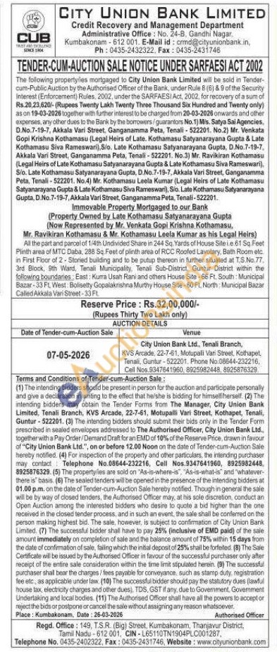 All the part and parcel of 1/4th Undivided Share in 244 Sq. Yards of House Siteie 61 Sq Feet Plinth area of MTC Daba, 288 So Feet of plinth area of RCC Roofed Lavotary, Bath Room etc in First Floor of 2-Storied building and to be putup thereon in further situated at T.S. No.77. 3rd Block, 9th Ward, Tenali Municipality, Tenali Sub-District, Guntur District within the following boundaries: East: Kurra Usah Rani and others House Site-66 Ft. South: Municipal Bazar-33 Ft, West: Bolisetty Gopalakrishna Murthy House Site-60 Ft. North: Municipal Bazar Called Akkala Vari Street-33 Ft.
