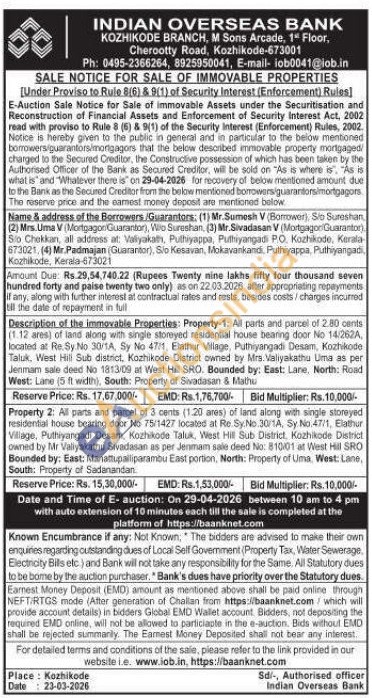 Description of the immovable Properties: Property-1: All parts and parcel of 2.80 cents (1.12 ares) of land along with single storeyed residential house bearing door No 14/262A, located at Re. Sy No 30/1A, Sy No 47/1, Elathur Village, Puthiyangadi Desam, Kozhikode Taluk, West Hill Sub district, Kozhikode District owned by Mrs. Valiyakathu Uma as per Jenmam sale deed No 1813/09 at West Hill SRO. Bounded by: East: Lane, North: Road West: Lane 15 ft width), South: Property of Sivadasan & Mathu
