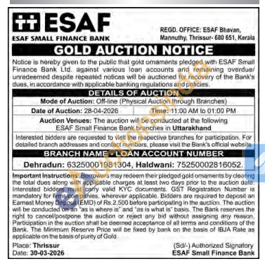 ESAF SMALL FINANCE BANK Gold Auctions Auction in Dehradun