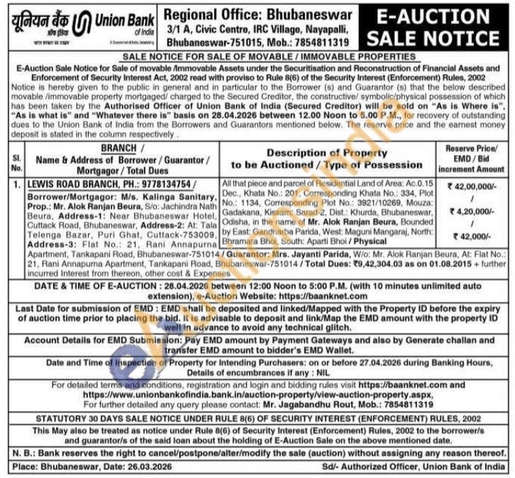 All that piece and parcel of Residential Land of Area: Ac.0.15 Dec., Khata No.: 201, Corresponding Khata No.: 334, Plot No.: 1134, Corresponding Plot No.: 3821/10269, Mouza: Gadakana, Kissam: Sarad-2, Dist.: Khurda, Bhubaneswar, Odisha, in the name of Mr. Alok Ranjan Beura, Bounded by East: Gandharba Parida, West: Maguni Mangaraj, North: Bhramara Bhoi, South: Aparti Bhoi/Physical