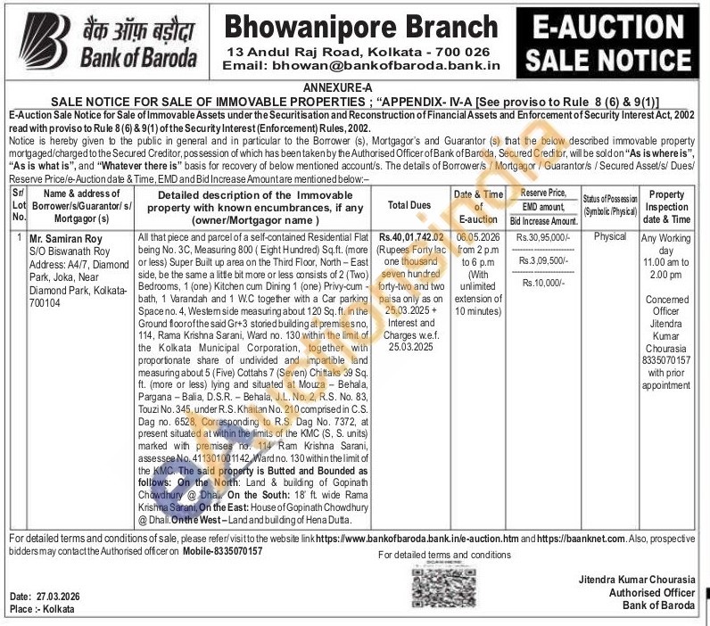 All that piece and parcel of a self-contained Residential Flat being No. 3C, Measuring 800 (Eight Hundred) Sq.ft. (more or less) Super Built up area on the Third Floor, North-East side, be the same a little bit more or less consists of 2 (Two) Bedrooms, 1 (one) Kitchen cum Dining 1 (one) Privy-cum bath, 1 Varandah and 1 W.C together with a Car parking Space no. 4, Western side measuring about 120 Sq. ft. in the Ground floorof the said Gr+3 storied building at premisesno, 114, Rama Krishna Sarani, Ward no. 130 within the limit of the Kolkata Municipal Corporation, together with proportionate share of undivided and impartible land measuring about 5 (Five) Cottahs 7 (Seven) Chittaks 39 Sq. ft. (more or less) lying and situated at Mouza - Behala, Pargana-Balia, D.S.R. Behala, J.L. No. 2, R.S. No. 83, Touzi No. 345, under R.S. Khaitan No. 210 comprised in C.S. Dag no. 6528, Corresponding to R.S. Dag No. 7372, at present situated at within the limits of the KMC (S, S. units) marked with premises no. 114 Ram Krishna Sarani, assessee No. 411301001142, Ward no. 130 within the limit of the KMC. The said property is Butted and Bounded as follows: On the North: Land & building of Gopinath Chowdhury @ Dhali. On the South: 18 ft. wide Rama Krishna Sarani, On the East: House of Gopinath Chowdhury @Dhall.On the West-Land and building of Hena Dutta.