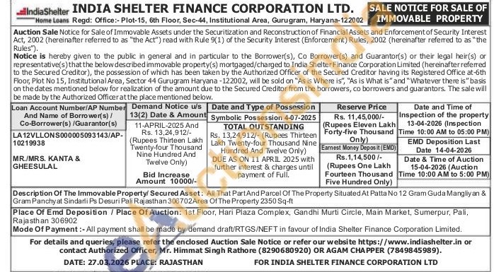 All That Part And Parcel Of The Property Situated At Patta No 12 Gram Guda Mangliyan & Gram Panchyat Sindarli Ps Desuri Pali Rajasthan 306702Area Of The Property 2350 Sq-ft