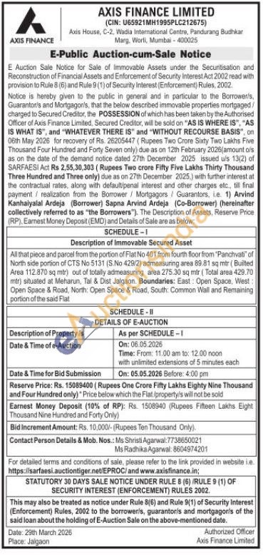 All that piece and parcel from the portion of Flat No 401 from fourth floor from "Panchvati of North side portion of CTS No 5131 (S.No 429/2) admeasuring area 89.81 sq mtr (Builted Area 112.870 sq mtr) out of totally admeasuring area 275:30 sq mir (Total area 429.70 mtr) situated at Meharun, Tal & Dist Jalgaon Boundaries: East: Open Space, West: Open Space & Road, North: Open Space & Road, South: Common Wall and Remaining portion of the said Flat