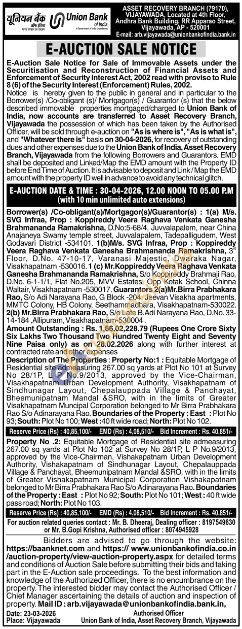 Property No.2: Equitable Mortgage of Residential site admeasuring 267.00 sq yards at Plot No 102 at Survey No 28/1P, LP No.9/2013, approved by the Vice-Chairman, Vishakapatnam Urban Development Authority, Vishakapatnam of Sindhunagar Layout, Chepalauppada Village & Panchayat, Bheemunipatnam Mandal &SRO, with in the limits of Greater Vishakapatnam Municipal Corporation Vishakapatnam belonged to Mr Birra Prabhakara Rao S/o Adinarayana Rao. Boundaries of the Property: East: Plot No 92; South: Plot No 101; West: 40 ft wide pass road; North: Plot No 103.