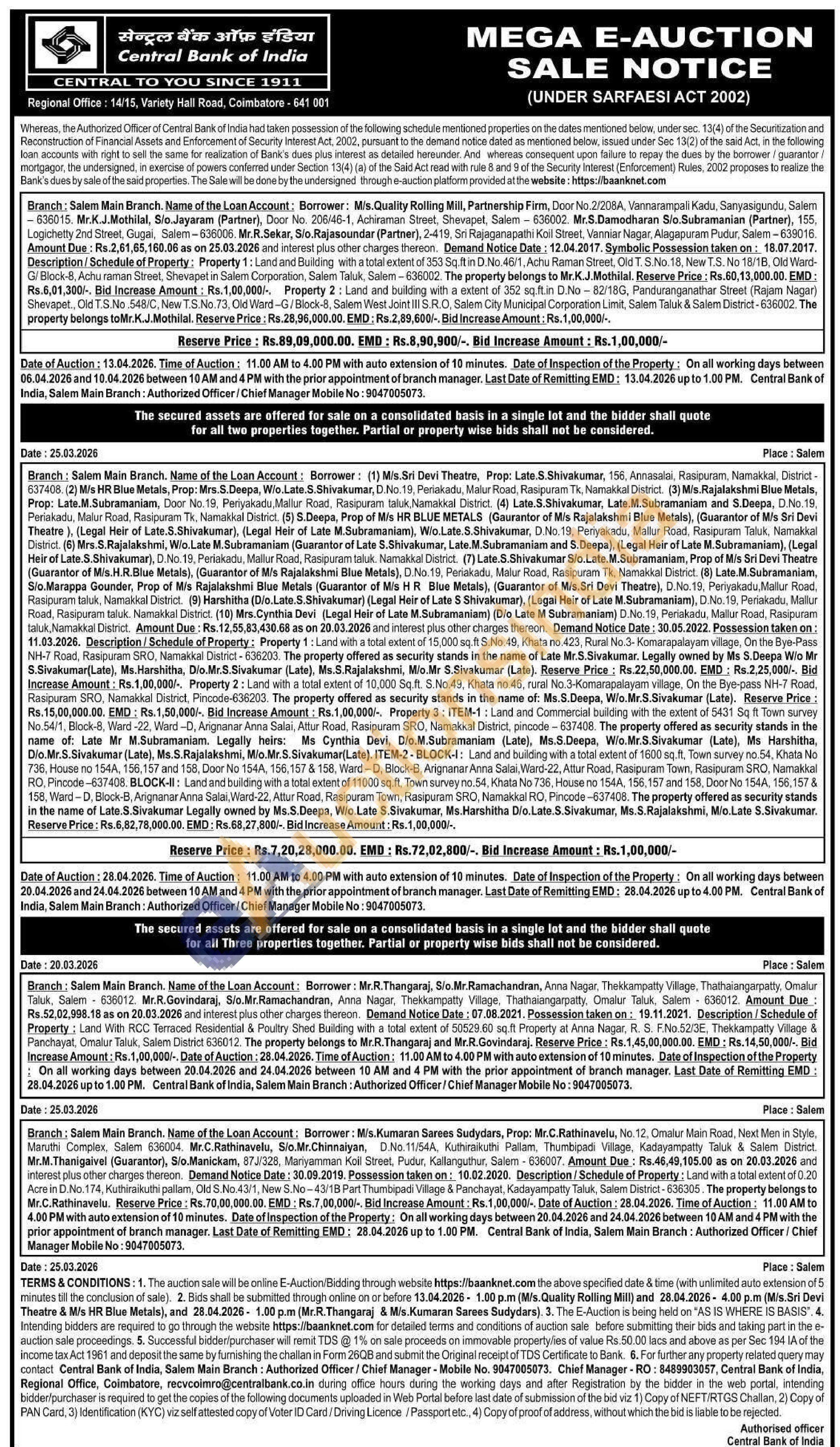Description Schedule of Property: Property 1: Lanic with a total extent of 15,000 sq. 5.No.49, Knata no.423, Rural No.3 Komarapalayam village, On the Bye-Pass NH-7 Road, Rasipuram ram SRO, Namakkal District-636203. The property offered as security stands in the name of Late Mr.S.Sivakumar. Legally owned by Ms 5. Deepa Wio Mr S.Sivakumar(Late), Ms. Harshitha, Dio Mr.S.Sivakumar (Late), Ms.S.Rajalakshmi, Mio Mir S.Sivakumar (Late). Reserve Price: Price: Rs 22.50.000.00. EMD EMD: Rs.2.25,000/-. Bid Increase Amount: Rs.1,00,000/- Property 2: Land with a total extent of 10,000 Sq.ft. S.No. 45. Khata no 46, rural No.3-Komarapalayam village. On the Bye-pass NH-7 Road Rasipuram SRO, Namakkal District, Pincode-636203. The property offered as security stands in the name of. Ms.5.Deepa, W/o.Mr.5.Sivakumar (Late). Reserve Price: Ra. 15,00,000.00. EMD: Rs.1,50,000. Bid Increase Amount: Rs.1,00,000/-, Property 3: ITEM-1: Land and Commercial building with the extent of 5431 Sq ft Town survey No.54/1, Block-8, Ward-22, Ward-D, Arignanar Anna Salai Attur Road, Rasipuram SRO, Namakkal District, pincode-637406. The property offered as security stands in the name of: Late Mr. M.Subramaniam. Legally heirs: Ms Cynthia Devi, Dio.M.Subramaniam (Late), Ms.S.Deepa, W/o.Mr.S.Sivakumar (Late), Ms Harshitha Dio.Mr.S.Sivakumar (Late), Ms.S.Rajalakshmi, Mio. Mr.S.Sivakumar(Late). ITEM-2-BLOCK-I: Land and building with a total extent of 1600 sq.ft. Town survey no. 54, Khata No. 736. House no 1544, 156, 157 and 158, Door No 154A, 156, 157 & 158, Ward-D. Bico-B. Arignanar Anna Salai Ward-22, Atur Road, Rasipuram Town, Rasipuram SRO. Namakkal RO. Pincode-637408, BLOCK-II: Land and building with a total extent of 11000 sq.ft. Town survey no.54, Khata No 736, House no 1544, 156, 157 and 158. Door No 154A, 156, 157& 158, Ward-D, Block-B, Arignaner Anna Salai, Ward-22, Attur Road, Rasipuram Town, Rasipuram SRC, Namakkal RO, Pincode-637408. The property offered as security stands in the name of Late. S.Sivakumar Legally owned by Ms.S.Deepa, Wio Late S.Sivakumar, Ms.Harshitha Dlo.Late. S Sivakumar, Ms.S. Rajalakshmi, Mio. Late S.Sivakumar Reserve Price: Rs 6,82,78,000.00. EMD: Rs.68,27,800- Bid increase Amount: Rs.1,00,000/-