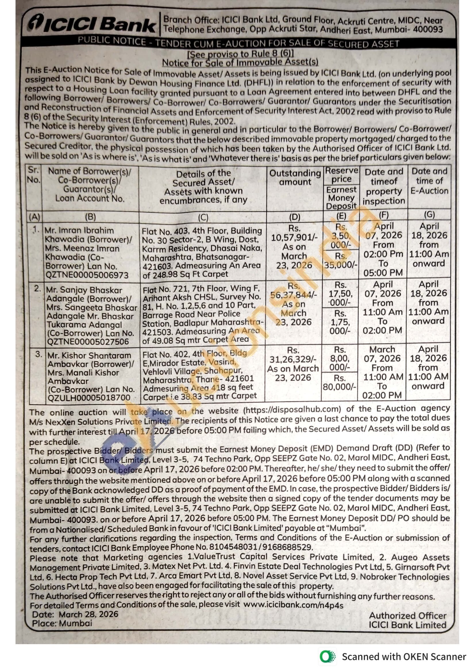 Flat No. 403, 4th Floor, BuildingNo. 30 Sector-2, B Wing, Dost. Karrm Residency, Dhasai Naka, Maharashtra, Bhatsanagar-421603. Admeasuring An Area of 248.98 Sq Ft Carpet