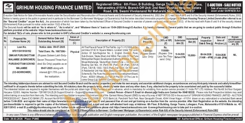 All That Piece & Parcal Of The Flat No. Lig-7-1-112 With A Car-pet Area Of 42.14 Square Meters. Located Under The Juris-diction Of Sub-Registrar No. 2, English Division, Pune, ( Sub-Division, Taluka Khed, And Within The Limits Of The Pune Metropolitan Region Development Authority (Pmrda), In Village Mouje Mahalunge, Taluka Khed, District Pune-On The Land Bearing Gat. Nos. 44 (Part), 49 (Part), 129 (Part), 130/1/A (Part), 130/1/8, 130/2, 130/3 (Part), And 130/4. On This Land, A Residential Unit Has Been Allotted Under The Government Scheme By The Pune Housing And Area Development Board, Pune-400001 (Mhada), As Part Of Phase-1 Of The Low In-came Group (Lig) Scheme (Comprising 419 Units).
