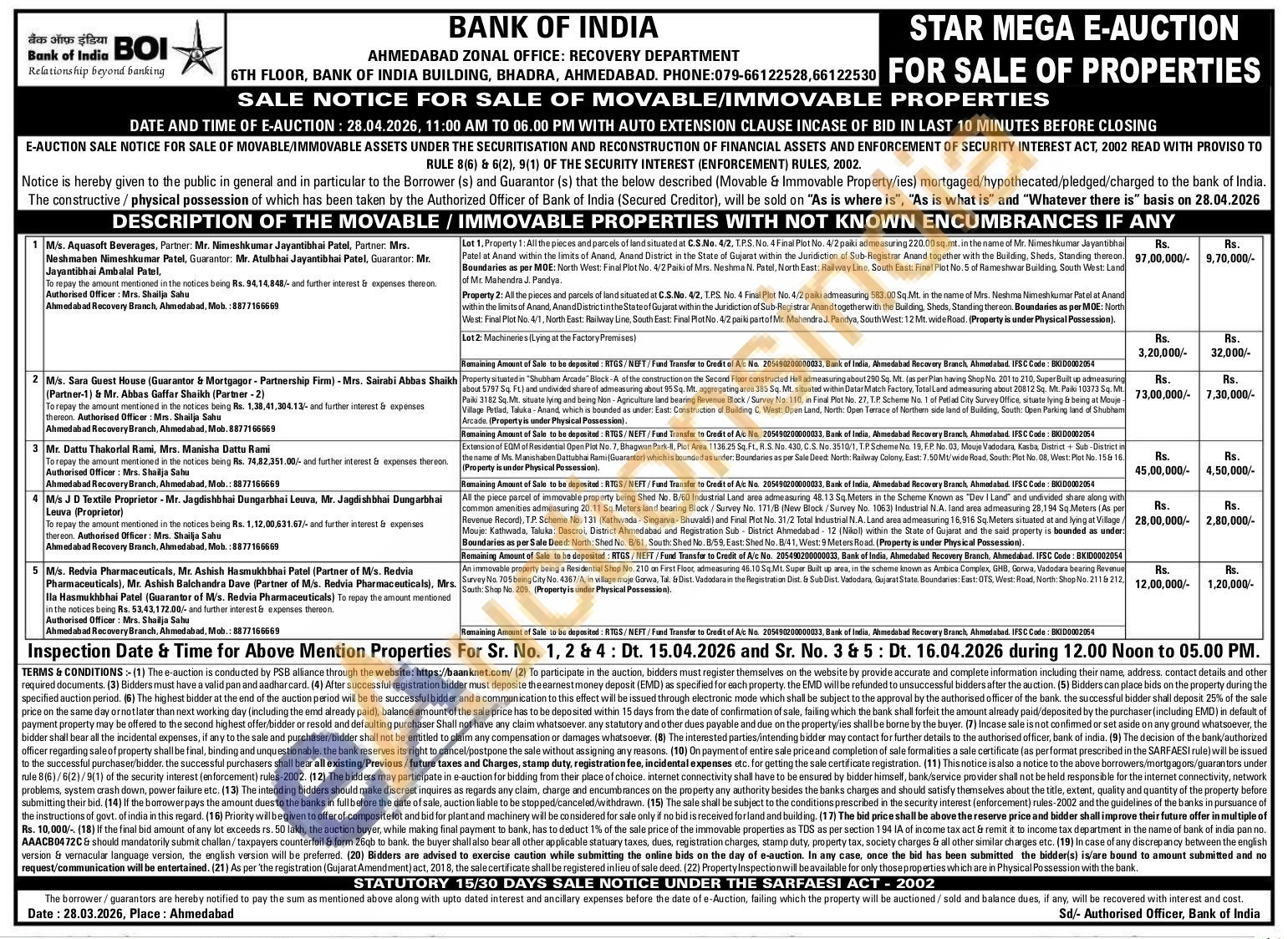 Contact Authorised Officer: Mrs. Shailja Sahu Ahmedabad Recovery Branch, Ahmedabad, Mob.: 8877166669