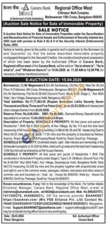 Description of Property: SCHEDULE A PROPERTY: All that piece and parcel of Residential 1 BHK flat in BDA property of Alur Village, Sy No 113 and the total land measuring of 64 houses (including building) in Block No 35 and 36 measuring East to West 59.20 mtrs, North to South 17.50 mtrs and the property is bounded as follows: East by: Road, West by: BDA Property Road, North by Road, South by: Passage. SCHEDULE B PROPERTY: Undivided share, night, title interest and ownership in the Schedule A property is 33.526 Sq Mtrs, total built up area and the total land measuring 1036 Sq mirs will be shared by all 64 House Owners. SCHEDULE C PROPERTY: All that piece and parcel of Residential 1 BHK Flat constructed in Schedule A Property under Stage 2, Type 2,8-38 Block, Ground Floor, Flat No B-36-004 "Alur BDA Flats", Alur Village, Dasanapura Hobli, Bangalore North Teluk 562123 measuring 33.526 Sq mirs and the property together with proportionate share and right to use in the common areas, passages, lobbies, staircases and other areas of common use and boundary on: East by: House No B36/005, West by House No 836-003, North by, Passage, South by House No 836/001.