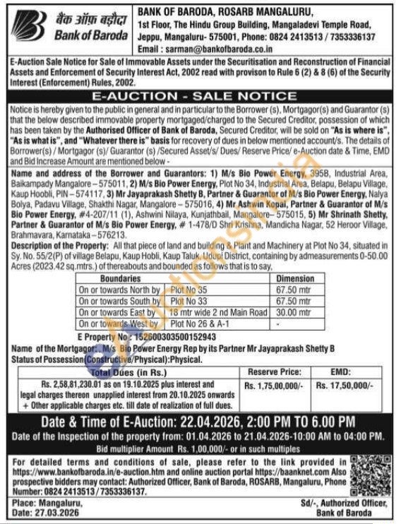 Description of the Property: All that piece of land and building & Plant and Machinery at Plot No 34, situated in Sy. No. 55/2(P) of village Belapu, Kaup Hobli, Kaup Taluk, Udupi District, containing by admeasurements 0-50.00 Acres (2023.42 sq.mtrs.) of thereabouts and bounded as follows that is to say,