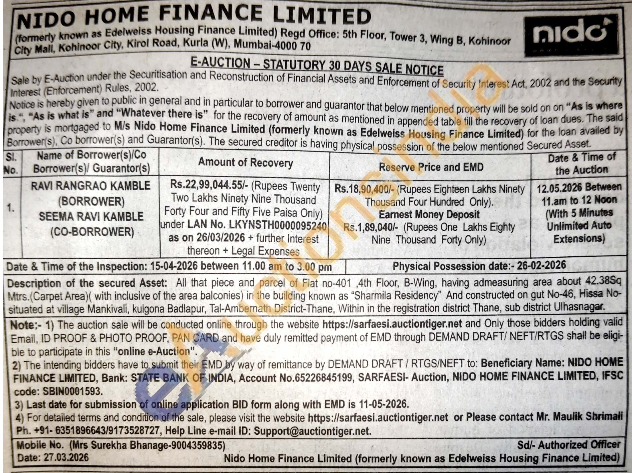 Description of the secured Asset: All that piece and parcel of Flat no-401,4th Floor, B-Wing, having admeasuring area about 42.38Sq Mtrs. (Carpet Area) (with inclusive of the area balconies) in the building known as "Sharmila Residency" And constructed on gut No-46, Hissa No-situated at village Mankivali, kulgona Badlapur, Tal-Ambernath District-Thane, Within in the registration district Thane, sub district Ulhasnagar.