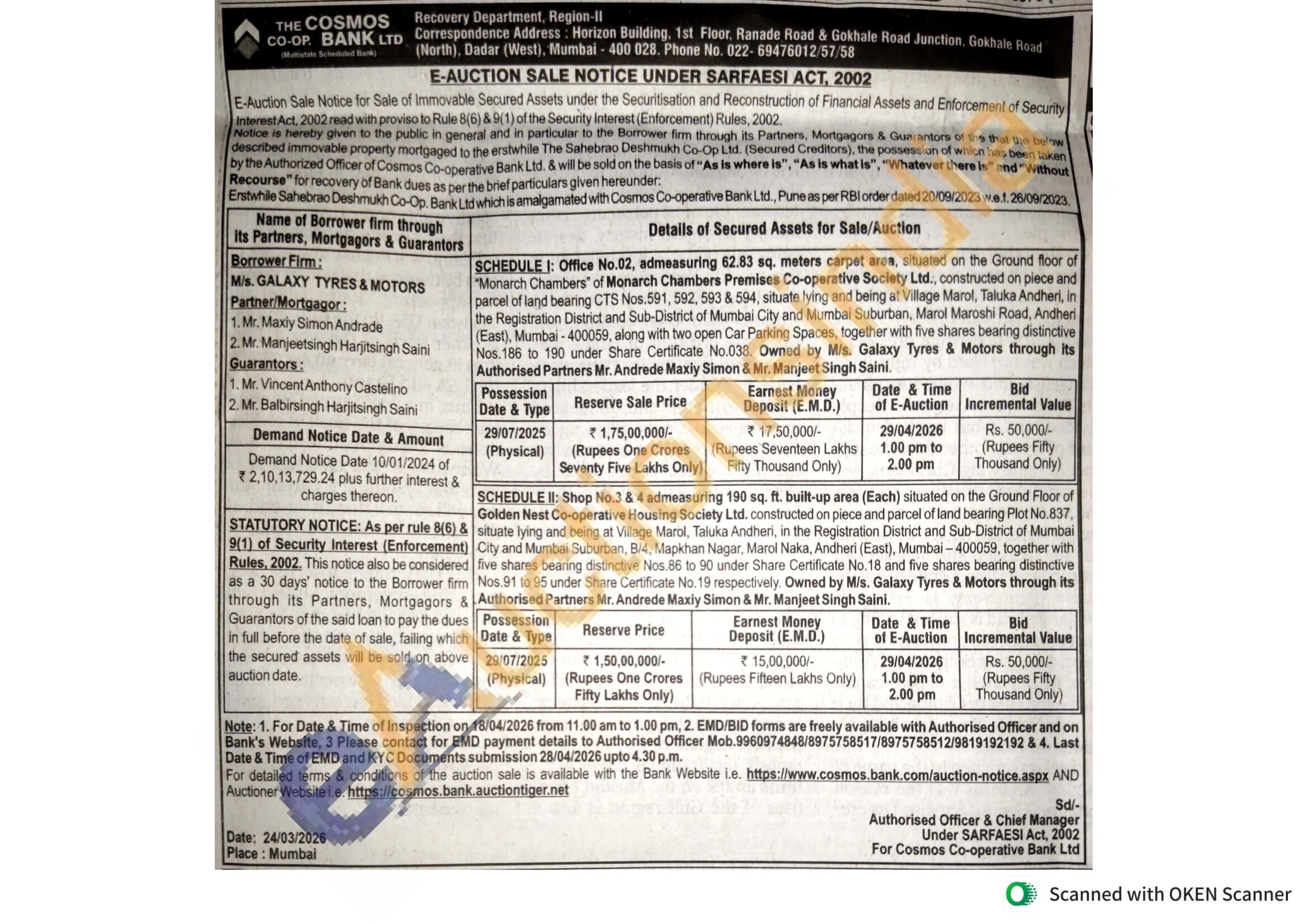 SCHEDULE: Office No.02, admeasuring 62.83 sq. meters carpet area, situated on the Ground floor of "Monarch Chambers of Monarch Chambers Premises Co-operative Society Ltd., constructed on piece and parcel of land bearing CTS Nos.591, 592, 593 & 594, situate lying and being at Village Marol, Taluka Andheri, in the Registration District and Sub-District of Mumbai City and Mumbai Suburban, Marol Maroshi Road, Andheri (East), Mumbai-400059, along with two open Car Parking Spaces, together with five shares bearing distinctive Nos.186 to 190 under Share Certificate No.038. Owned by M/s. Galaxy Tyres & Motors through its Authorised Partners Mr. Andrede Maxly Simon & Mr. Manjeet Singh Saini.