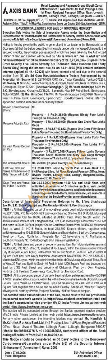 Description of Immovable Properties Belongs to Mr. S.Veerbhadrappa S/o. Mr. S.K. Shivalingappa and Mrs Umadevi W/o Mr.S.VeerbhadrappaITEM-II: Al that piece and parcel of property bearing item No.1) Municipal Assessment No.438/305, PID No.1-515-371, situated at KR Layout, within the administrative limits of City Municipal Council Tiptur, East to West 30 Feet and North to South 30 Feet, in total 900 Square Feet and Item No.2) Municipal Assessment No.439/306, PID No.1-515-371, situated at KR Layout, within the administrative limits of City Municipal Council Tiptur, East to West 30 Feet and North to South 40 Feet, in total 1200 Square Feet and bounded on: East by: 3 1/2 Feet Street and property of Chikanna, West by Own Property. North by: 3 1/2 Feet and Conservancy Road, South by: Municipal Road