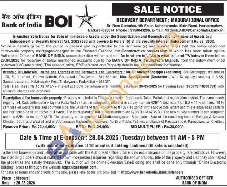 Description of the Immovable property: Property situated at In Thanjavur district, Orathanadu Taluk, Pattukottai registration district, Thiruvonam sub registry, 84, Kaduvettividuthi village in Patta No. 1797 as per computer chitta and in survey number 628/11 total extent 0.18.0 44 ½ cent less 10 15 cent less on western side and southern side, the 34 cents of land-14844 sq ft 1377.18 sqmtr in the above total extent and this is situated at Eastern and northern side of the above total extent. The corresponding old survey numbers are 628/7D and 628/701. The new survey number as per computer chitta is 628/11A extent 0.13.75. The property in the name of Mr.Muthuthangappa. Boundaries: East of the remaining land of Rajappa & Selvam Chettiar, South and West of land of V. Chinnappa Kaduvettian vagayara, North of Public Pathway and lands of Rajappa and A. Ramachandran Chettiar