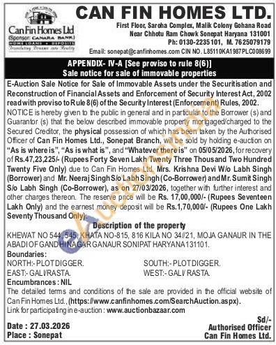 Description of the property : KHEWAT NO 544, 545, KHATA NO-815, 816 KILA NO 34//21, MOJA GANAUR IN THE ABADI OF GANDHI NAGARGANAUR SONIPAT HARYANA 131101.