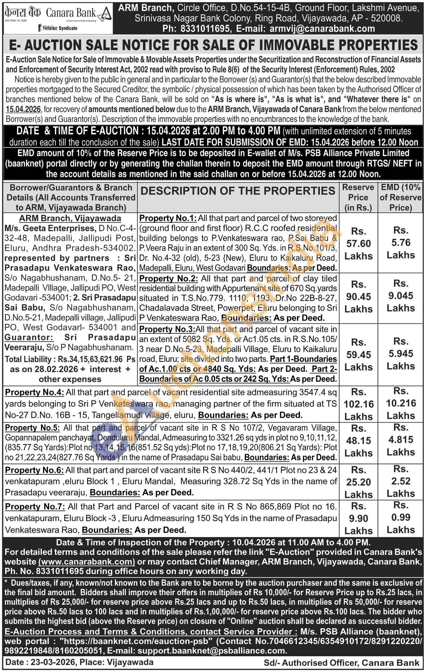 Property No.6: All that part and parcel of vacant site R S No 440/2, 441/1 Plot no 23 & 24 venkatapuram,eluru Block 1, Eluru Mandal, Measuring 328.72 Sq Yds in the name of Prasadapu veeraraju, Boundaries: As per Deed