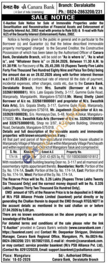 All that part and parcel of Non-agricultural immovable house situated in Manjanady Village of Mangalore Taluk within Manjanady Village Panchayath and within registration Sub-District of Mangalore Taluk and comprised in: