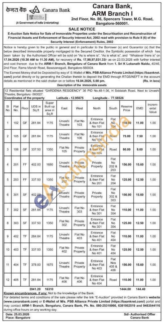 Description of the immovable assets : 12 Residential flats situated "GARDENIA RESIDENCY 36 PID No.48-1-36, H Siddaiah Road, Next to Urvash Theatre, Bengaluru-560027.