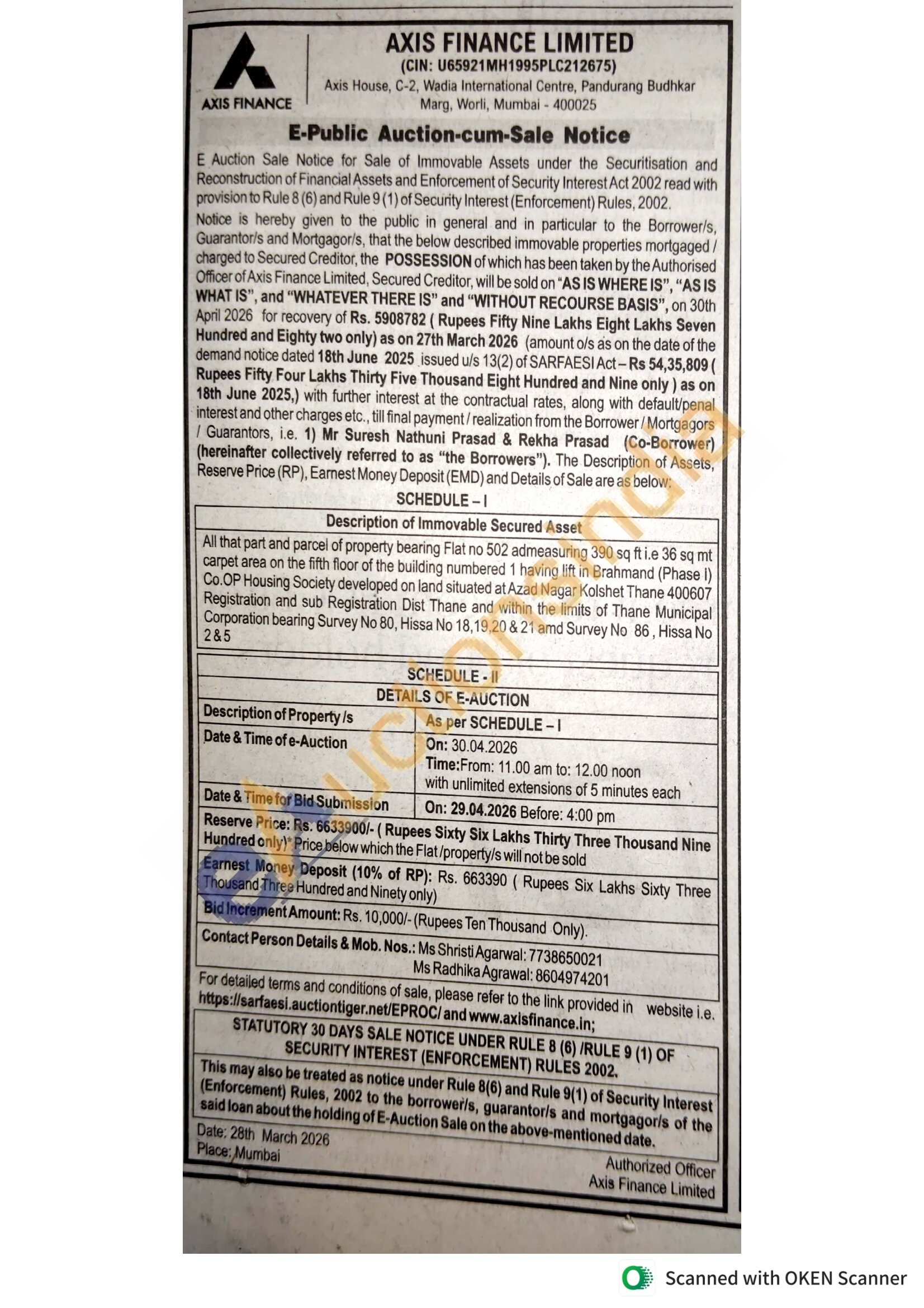 All that part and parcel of property bearing Flat no 502 admeasuring 390 sq fti.e 36 sq mt carpet area on the fifth floor of the building numbered 1 having lift in Brahmand (Phase 1) Co.OP Housing Society developed on land situated at Azad Nagar Kolshet Thane 400607 Registration and sub Registration Dist Thane and within the limits of Thane Municipal Corporation bearing Survey No 80, Hissa No 18,19,20 & 21 amd Survey No 86, Hissa No 285