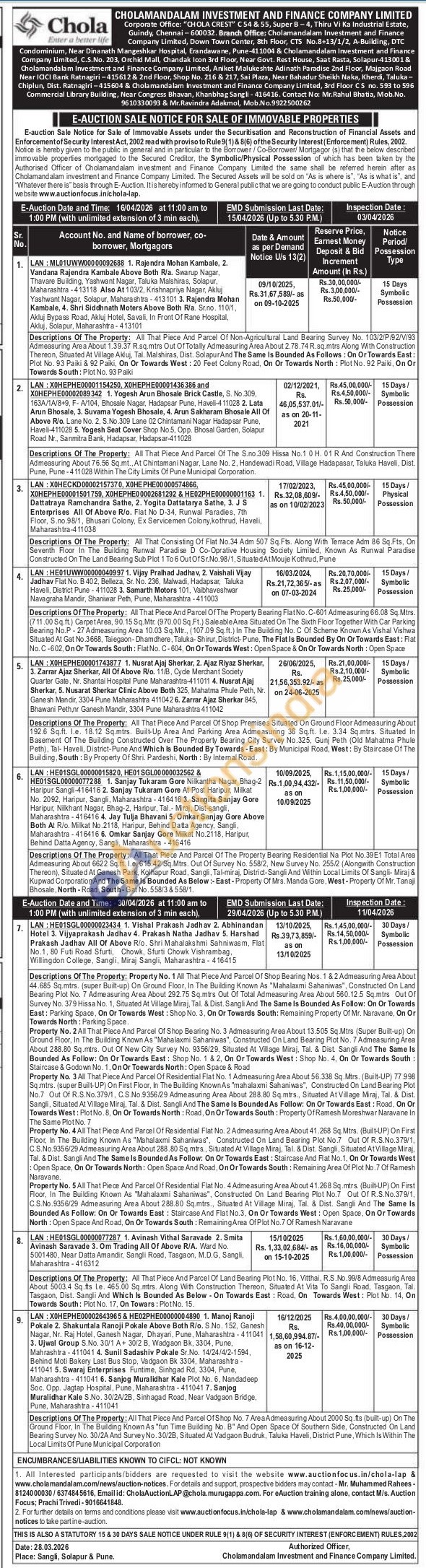 Descriptions Of The Property: All That Piece And Parcel Of The S.no.309 Hissa No.1 0 H. 01 R And Construction There Admeasuring About 76.56 Sq.mt., At Chintamani Nagar, Lane No. 2, Handewadi Road, Village Hadapasar, Taluka Haveli, Dist. Pune, Pune 411028 Within The City Limits Of Pune Municipal Corporation