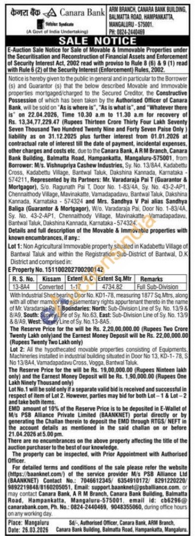 Details and full description of the Movable & Immovable properties with known encumbrances, if any: Lot 2: All the hypothecated movable properties consisting of Equipments, Machineries installed in industrial building situated in Door No 13, KD-1-78, S No 13/844, Vamadapadavu Cross, Vogga, Bantwal Taluk