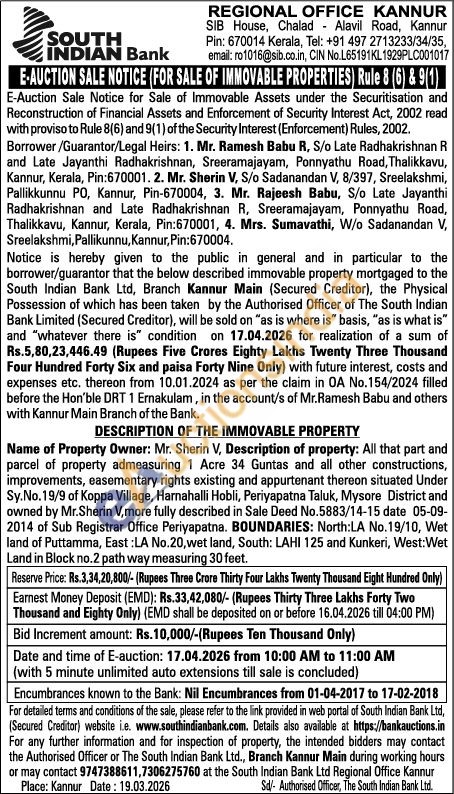 All that part and parcel of property admeasuring 1 Acre 34 Guntas and all other constructions, improvements, easementary rights existing and appurtenant thereon situated Under Sy.No. 19/9 of Koppa Village, Harnahalli Hobli, Periyapatna Taluk, Mysore District and owned by Mr.Sherin V, more fully described in Sale Deed No.5883/14-15 date 05-09-2014 of Sub Registrar Office Periyapatna. BOUNDARIES: North:LA No. 19/10, Wet land of Puttamma, East: LA No.20, wet land, South: LAHI 125 and Kunkeri, West:Wet Land in Block no.2 path way measuring 30 feet.