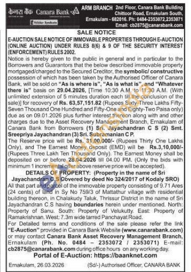 Jayachandran C.S Covered by deed No 324/2017 of Kodaly SRO) : All that part and parcel of the immovable property consisting of 9.71 Ares (24 cents) of land in Sy No 759/3 of Mattathur village with residential building thereon, in Chalakudy Taluk, Thrissur District in the name of Sri Jayachandran C.S having boundaries herein under mentioned. North: Property of Sanu. South: Property of Velukutty. East: Property of Ramakrishnan, West: 7.3m wide tarred Panchayat Road