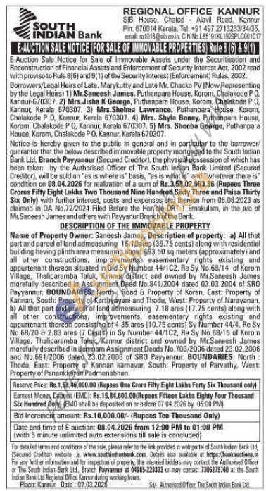 Name of Property Owner: Saneesh James, Description of property: a) All that part and parcel of land admeasuring 16.1,pares (39.75 cents) along with residential building having plinth area measuring about 493.50 sq.meters (approximately) and all other constructions, improvements, easernentary rights existing and appurtenant thereon situated in Old Sy Number 44/1C2, Re Sy No.68/14 of Korom Village, Thaliparamba Taluk, Kannur district and owned by Mr.Saneesh James morefully described in Assignment Deed No.841/2004 dated 03.03.2004 of SRO Payyannur, BOUNDARIES: North Road & Property of Koran, East: Property of Kannan, South: Property of Karthyayani and Thodu, West: Property of Narayanan. b) All that part and parcel of land admeasuring 7.18 ares (17.75 cents) along with all other constructions, improvements, easementary rights existing and appurtenant thereon consisting of 4.35 ares (10.75 cents) Sy Number 44/4, Re Sy No.68/20 & 2.83 ares (7 Cents) in Sy Number 44/1C2, Re Sy No.68/15 of Korom Village, Thaliparamba Tahuk, Kannur district and owned by Mr.Saneesh James morefully described in denmam Assignment Deeds No.703/2006 dated 23.02.2006 and No.691/2006 dated 23.02.2006 of SRO Payyannur. BOUNDARIES: North: Thodu, East: Property of Kannan karmavar, South: Property of Parvathy, West: Property of Panankkärar Padmanabhan.