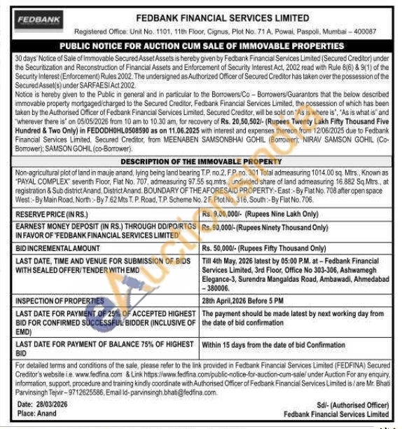 Non-agricultural plot of land in mauje anand, lying being land bearing T.P. no.2. F.P. no. 301 Total admeasuring 1014.00 sq. Mirs, Known as "PAYAL COMPLEX seventh Floor, Flat No. 707, admeasuring 97.55 sq.mtrs., undivided share of land admeasuring 16.882 Sq.Mtrs, at registration & Subs district Anand, District Anand BOUNDARY OF THE AFORESAID PROPERTY-East:-By Flat No. 708 after open space West:-By Main Road, North: By 7.62 Mts T. P. Road, TP. Scheme No. 2F. Plot No. 316, South:-By Flat No. 706.