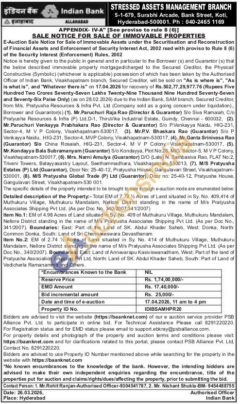 Detailed description of the Property:- Total EM of 7.72 1/2 Acres of Land situated in Sy. No. 409,414 of Muthukuru Village, Muthukuru Mandalam, Nellore District standing in the name of M/s Pratyusha Associates Shipping Pvt Ltd. (As per Doc No. 340/2007,341/2007)
