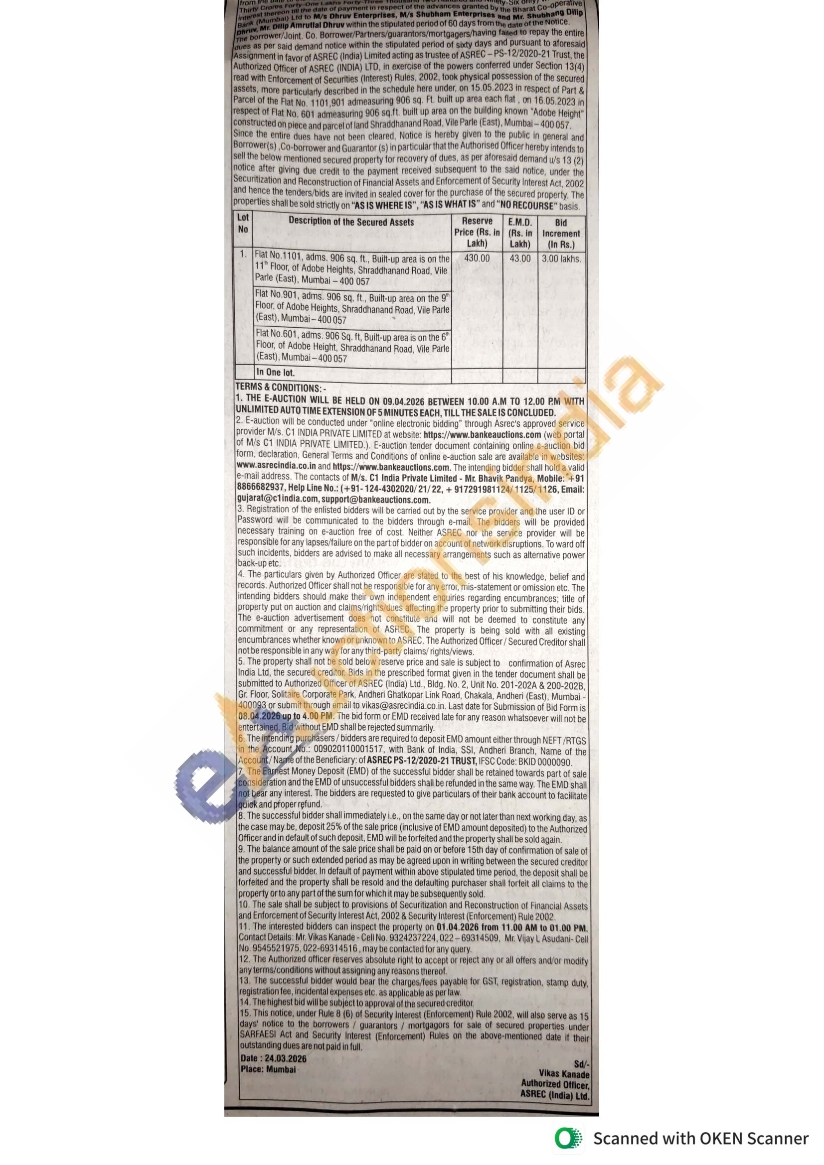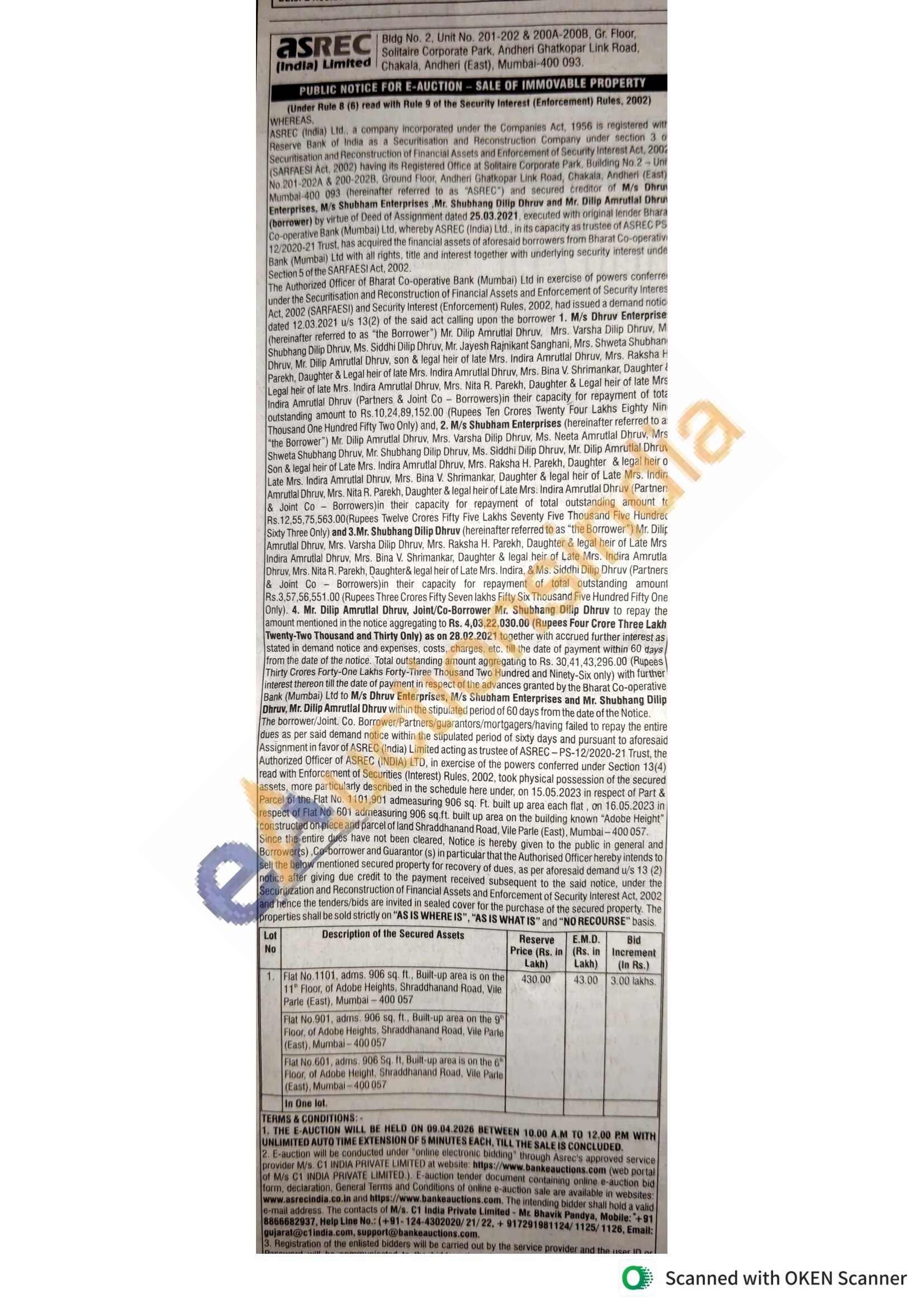 Flat No.1101, adms. 900 sq. ft. But up are on the 11 Floor, of Adobe Heights. Shraddhanand Road, Vile Parte (East), Mumbai-400 057