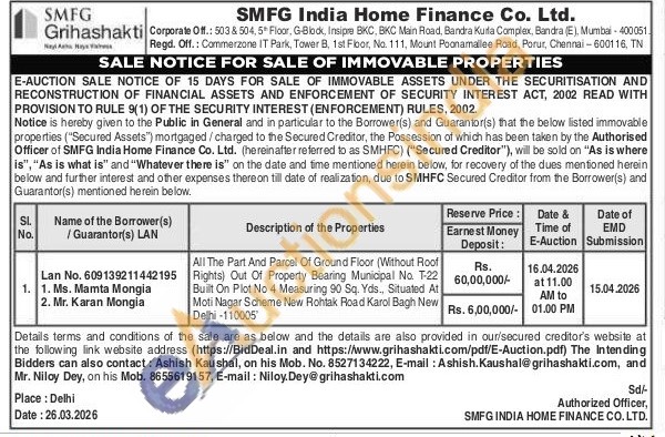 All The Part And Parcel Of Ground Floor (Without Roof Rights) Out Of Property Bearing Municipal No. T-22 Built On Plot No 4 Measuring 90 Sq. Yds., Situated At Moti Nagar Scheme New Rohtak Road Karol Bagh New Delhi-110005